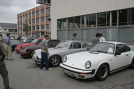 ![]() | 色とりどりのポルシェが並んだ高山短期大学。雨の中、参加者のみなさんは傘を差しながら思いおもいにポルシェを見学しています |
