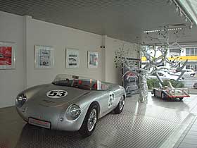 | ポルシェセンターの中に入ると、中はムチャクチャ広い。奥のちょっとしたステージに、550スパイダーが展示してある。 | ![]() |