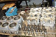 エンジンの一部、ここでも見っけ。シリンダーやらシリンダーヘッドやらが整然と並べられているサマは、理科室というよりも手術室みたい |