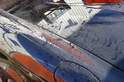 | トランクフードは、少しだけ水はけが悪くなっているような。といっても、このあと、大半は流れ落ちてしまうんですけどね。流れ落ちる勢いが、多少弱まったかな | 場所によっては、このように水滴が残る。でも、これはガラスコーティングをしてもらった最初から、ここはこんな感じだった |